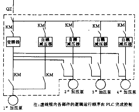图1系统硬件结构 1、上位机: 水厂需24h连续运转,现场干扰源多、环境恶劣。因此,上位机选用了具有较高可靠性、较强抗干扰能力的研华(ADVANTECH)IPC610/486型工业用微机。上位机与PLC之间采用RS232标准串行口进行通讯,传输速率9600b/s,11位数据格式,数据长度7位,1位校验位,启动1位,停止2位。另选研华10位A/D采集卡,采集蓄水池水位信号和加压泵组出水流量信号,对水位信号运用模糊算法进行计算后,给出控制信息由PLC控制潜水泵的启动台数。当水位过低时,认为发生故障,停止一、二次泵组的运行并声光报警。上位机为720M硬盘、8M内存,可以同时处理大量数据且历史记录较长。 2、主控单元: 主控单元选用日本立石公司的C60P型可编程序控制器作为主控单元,它具有4 0路开关量的输入、20路开关量的输出,可扩展模入、模出模块,并有RS232标准串口。C60P为积木式结构,系统构成及扩展方便,抗干扰性能好,作为现场主控部件较理想。由它完成自动倒泵、防水锤互锁、变频器逻辑控制等逻辑控制功能。 3、管网恒压调控系统: 调速泵的调节由富士G45变频器来完成,由压力传感器采取用户管网的压力信号(4mA~20mA)送至自制的调节板上,与给定信号比较后送至日产RKC调节器中,经PID运算后产生调节信号送至变频器,控制变频器的输出频率,调节水泵转速。变频器本身对应其输出频率有0~5V(DC)信号输出,将其引回调节板,由系统对输出频率进行检测,若变频器的输出大于49Hz一定时间后,管网压力仍达不到要求,延时确定后,PLC按照一定规则逐个以自耦减压方式启动恒速泵,直至管网压力恒定。若变频器输出频率小于23Hz一定时间后,管网压力仍超过给定值,则依次关闭恒速泵,配合调整调速泵直至压力稳定。 4、自耦减压启动柜: 恒速泵及潜水泵均采用自耦减压启动方式,有效地减小了电动机启动时对电网的冲击。 5、传感器及执行机构: 管网压力信号的采取利用最大量程为1.0MPa的远传压力表,以方便在采样点观察压力信号;流量信号的采取利用涡街流量计;水位信号的采取利用压力式水位传感器;利用电动蝶阀作为执行机构来控制加压泵的出水口状态。 四、系统的软件 系统软件主要包括上位机管理程序、PLC控制与监测程序以及它们之间的通讯程序。 1、上位机的管理程序主要完成设备运行状况的图形显示监测、生产状况的数据库管理、检测数据的处理、菜单处理以及报警等功能。采用C语言结合汇编编程,充分利用C语言结构化强、简洁和运行速度快等优点,同时也提高了程序的可读性、可靠性及可移植性。软件设计采用模块化结构,人机界面为图形形式,菜单驱动,全部中文显示与提示非常友好。系统主要功能模块包括:使用说明、水厂控制系统功能介绍、生产状况监测及管理、水位系统的运行状态控制等。采用查询方式完成与PLC的通讯及检测数据的处理;将管网压力、流量、液位、各水泵运行状态及各处阀门开启状态等信息以图形及数据的方式显示于显示器上;如有报警信号则显示相应图形,同时进行声光报警。监测的出水量、耗电量等信号可长期保存于存储器中,随时作为资料查询。 2、蓄水池分为沉淀池和出水池两部分,深井水首先在沉淀池沉淀泥沙、消毒处理,而后,经过滤到达清水池。因此,水位控制功能要求较高,正常状态下,1~2台潜水泵长期运转,其余根据用水量的大小自动切换。为保证水的正常供应并防止潜水泵的频繁启停,在水位控制中采用了模糊算法。将水位高度分为七级,将水位的变化率也分为七级,将潜水泵的开启台数分为5档,形成了一个二维矩阵数组,由计算机运算后确定应开启的深井泵台数。经反复试验后,确定了数组中各参数的值,经实际使用,获得了较好的运行效果。 3、可编程控制器作为主控单元,几乎所有的现场逻辑控制均与其有关。它的控制程序具有较强的逻辑性要求。一般来说变频器严禁付边加装接触器,但是为了节省投资、实现4台恒速泵轮流作为调速泵,必须在变频器的付边装接触器(电路原理图如图2所示)。为防止在电动机高速运转时,当变频器的原边未切断电源或刚刚切断电源,付边接触器断开,电动机定子线圈放电造成高电压,损坏变频器的输出功率模块,在PLC的程序设计中必须考虑到较复杂的互锁及时间控制关系,即PLC计算倒泵时间到后,首先按照阀、泵互锁关系关闭拟转入变量运行的定量泵;接着关闭原变量泵,此时变频器输出频率先降至零,而后切断变频器原边接触器,延时几秒后,切断其付边接触器。而后,将变频器输出与待转入变量运行的水泵接通,几秒后按照阀、泵开启的顺序依次接通变频器的电源,启动水泵并打开水阀;同时,原调速泵转为恒速泵使用,这样做保证4台加压泵的运转时间相近,避免某台泵长时间不运转发生锈蚀等故障。
